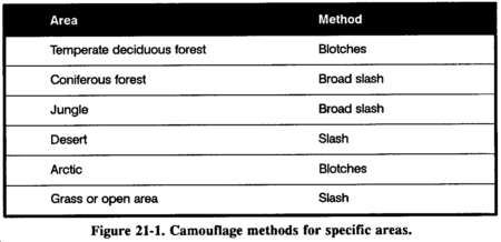 Figure 21-1 gives a general idea of how to apply camouflage for various areas and climates. Use appropriate colors for your surroundings. The blotches or slashes will help to simulate texture.