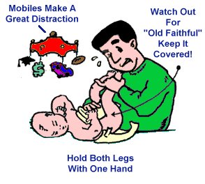 Your job can be made much easier if you can keep the baby entertained long enough to keep still while you do the changing. Either you or someone else can create the diversion, or a mobile above might also do the trick. A stuffed toy within sight can help, or perhaps a toy when the baby gets bigger. But keep the changing accessories out of baby's reach - and thus out of his or her mouth.