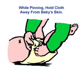 When using cloth diapers, pin the diaper, always keeping your hand between the skin and the diaper to avoid sticking the baby. The diaper should be tight enough to protect leaks but not so much that it irritates the baby's skin.