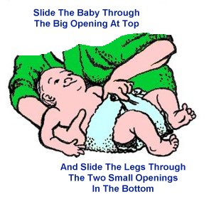 Bring the baby over to a sturdy, flat, clean surface. Lay out the diaper so that the outside tips are closer to the baby's belly button, and the top tip is closer to the baby's knees. Insert the baby through the big hole and guide the baby's legs through the little holes on the sides. Adjust the pins.