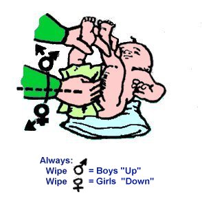 With a warm washcloth or diaper wipe, wipe girls from front to back, and boys from back to front. A good idea here is to keep a fresh diaper draped over a baby boy's penis (as a defensive measure!) while changing him.