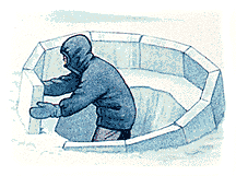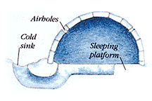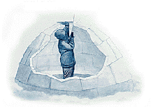 With warmth inside the igloo, the surface of the walls will melt and freeze over, to form a smooth, airtight ice surface. The roof over entrance tunnel prevents snow from blowing into igloo.
