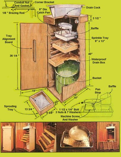 the operator of the sprout box has to do, then is: Of course, whether you decide to grow sprouts by the "batch" method (which involves loading the cabinet with seeds all at once, and harvesting a large crop of sprouts all at once several days later) or by the "continuous harvest" method (which, as the name implies-calls for "sowing" a small amount, say one "tray full" of seed every day and reaping a corresponding amount of vegetation every 24 hours, is up to you. If you plan to process a large quantity of sprouts into flour, chances are you'll want to use the "batch" method. On the other hand-if you and/or your animals want to eat fresh sprouts every day, you'd probably do best to take the continuos harvest route. | |