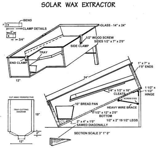 The principles of wax extractor design are always the same, although the details of each specific apparatus may differ. Bits of wax, old comb and other scrapings from the hive are placed on a slanted (usually metal) tray inside a box. The box is then covered tightly with a glass top and oriented toward the sun. As the temperature rises inside the box, the wax melts and drips off the tray into the collector pan. This pan usually has slanted sides, facilitating removal of the wax block once it hardens. A suggested plan for building an extractor is shown below.