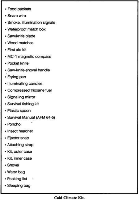 The Army has several basic survival kits, primarily for issue to aviators. There are kits for cold climates, hot climates, and overwater. There is also an individual survival kit with general packet and medical packet. The cold climate, hot climate, and overwater kits are in canvas carrying bags. These kits are normally stowed in the helicopter's cargo/passenger area.