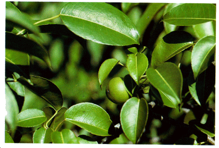 Description: The strychnine tree is a medium-sized evergreen, reaching a height of about 12 meters, with a thick, frequently crooked trunk. Its deeply veined oval leaves grow in alternate pairs. Small, loose clusters of greenish flowers appear at the ends of branches and are followed by fleshy, orange-red berries about 4 centimeters in diameter.