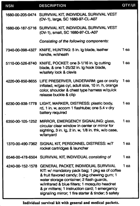 An aviator's survival vest (SRU-21P), worn by helicopter crews, also contains survival items.