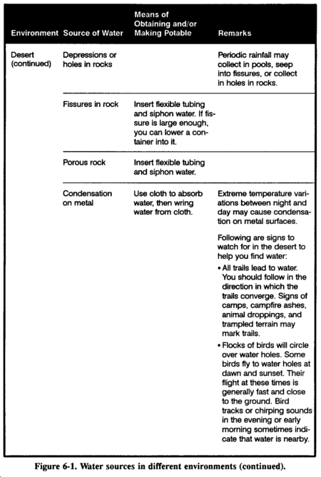 Almost any environment has water present to some degree. Figure 6-1 lists possible sources of water in various environments. It also provides information on how to make the water potable.