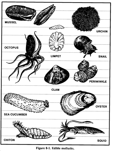 This class includes octopuses and freshwater and saltwater shellfish such as snails, clams, mussels, bivalves, barnacles, periwinkles, chitons, and sea urchins (Figure 8-1). You find bivalves similar to our freshwater mussel and terrestrial and aquatic snails worldwide under all water conditions.