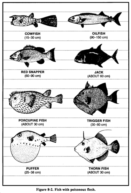 Certain saltwater species of fish have poisonous flesh. In some species the poison occurs seasonally in others, it is permanent. Examples of poisonous saltwater fish are the porcupine fish, triggerfish, cowfish, thorn fish, oilfish, red snapper, jack, and puffer (Figure 8-2). The barracuda, while not actually poisonous itself, may transmit ciguatera (fish poisoning) if eaten raw.